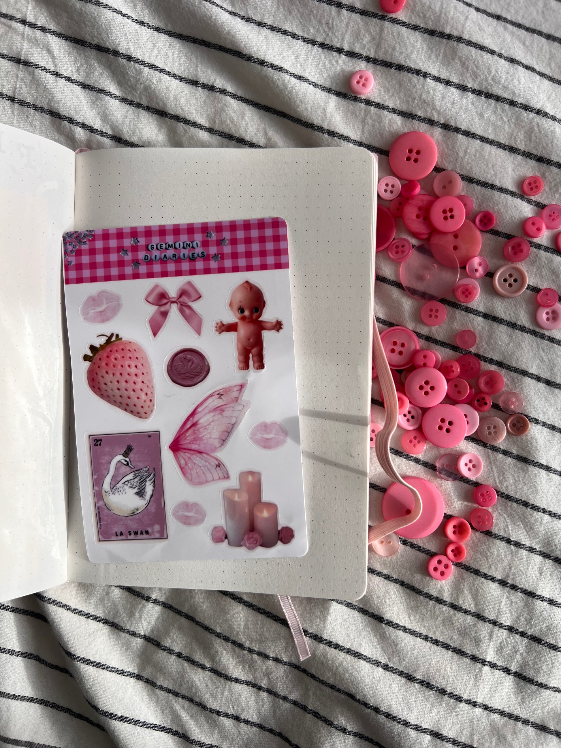 The theme of this sticker sheet is soft, feminine, and vintage-inspired with a dreamy, romantic aesthetic. The color palette is predominantly pink, featuring elements such as a delicate swan, a strawberry, butterfly wings, candles, a pink bow, and a vintage-style baby doll. The mix of elements add a nostalgic and whimsical touch.