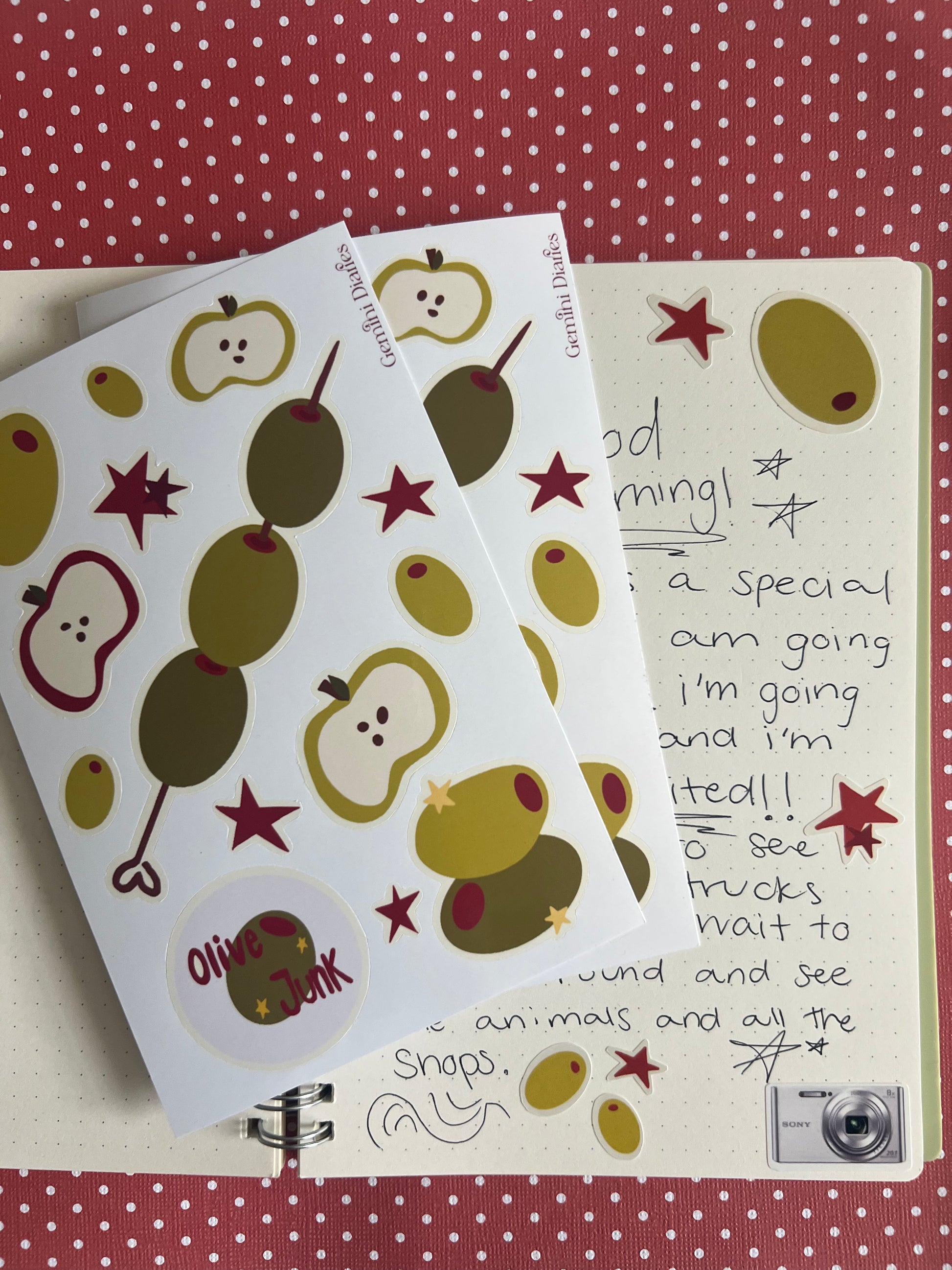 This hand drawn sticker sheet mixes quirky olives, cosmic stars, and sweet apple slices for a playful pop in your journal, planner, or happy mail. Perfect for collectors and sticker lovers who olive a little charm in their day.